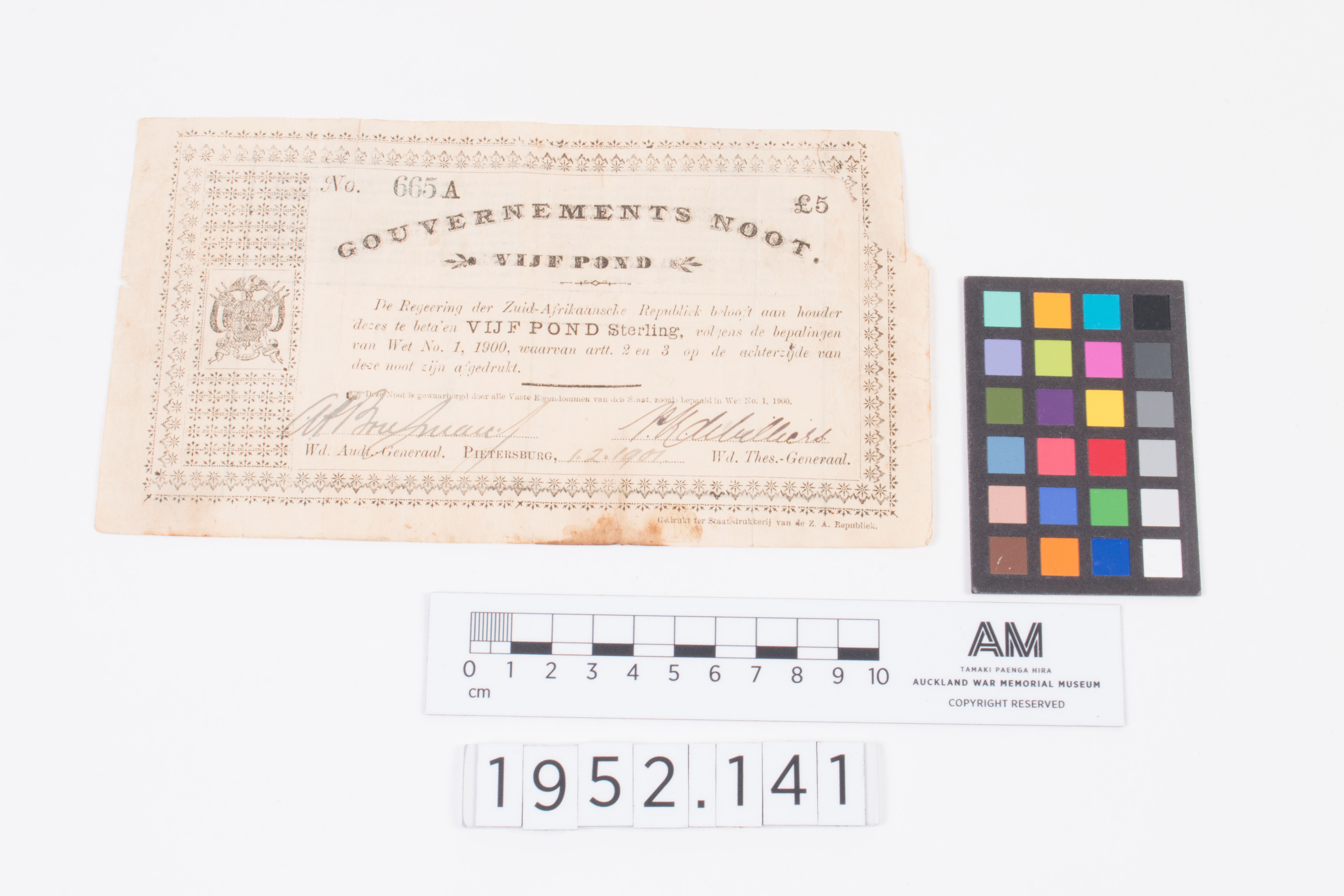 English: Five pound note, South Africa Republic 1.2.1901 Zuid Afrikaansche Republiek, No 665A