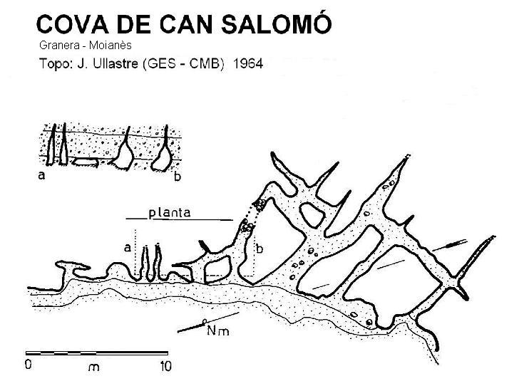 Català: Mapa topogràfic de la cova del Salomó, a Granera. Fet per J. Ullastre, del Grup d'Exploracions Subterrànies del Club Muntanyenc Barcelonès, el 1964.